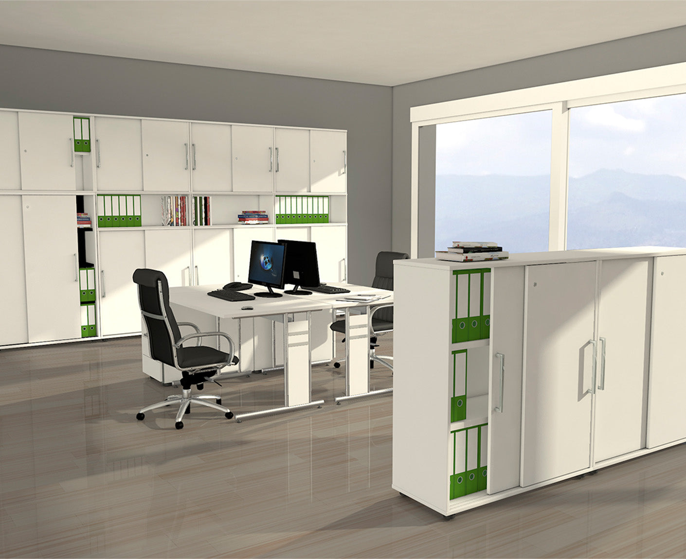 - Seitenblende/Kabelkanal vertikal weiß mit silber Dekorstreifen.