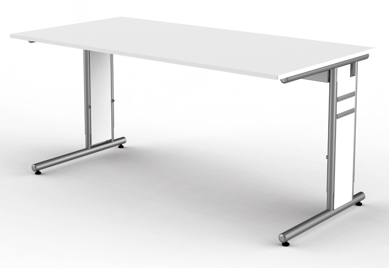 -Typ B: stabiles C-Fuß-Gestell, aus Rechteckrohr60 x 25 mm höhenverstellbar von 680-820mm und einer Stahlblende in silber mit weißem Dekorstreifen. Blende gleichzeitig Kabelkanal zur vertikalen Kabelführung. Fußausleger aus Flachovalrohr 50 x 25 mm auf Stellfüßen.