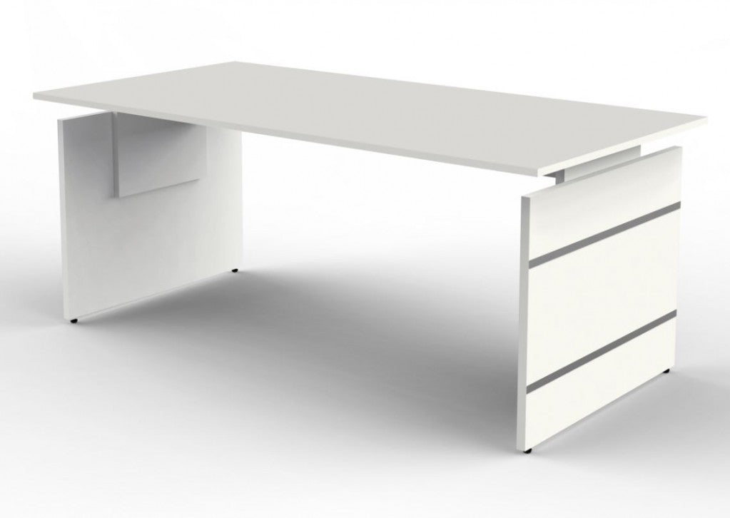 Das neue Büromöbelprogramm mit Applikationen in Alusilber und trendigen Dekoren. Sie können zwischen 3 Tischplattendekoren ( Weiß, Grafit oder Wenge) und 4 Gestellformen (C-Fuß-Gestell Typ B, C und D oder 1 Wangengestell Typ A) wählen. Optional können die Schreibtische mit einer Knieraumblende und einer Sichttrennwand werden. Zudem bietet das C-Fuß-Gestell Typ B und C und das Wangengestell Typ A die Möglichkeit die Tischplatte in der Höhe einzustellen.Stauraum für die Verkabelung bietet der serienmäßig vorhandene Kabelkanal. Zur Vergrößerung der Arbeitsfläche oder für kleinere Besprechungen ergänzen Sie die Schreibtische durch entsprechende Anbautische. Als Ergänzug stehen weiße Rollcontainer mit großem Stauraum, da 80 cm tief, zur Verfügung. Wählen Sie hier zwischen 3 Schubladen oder 1 Schublade und Hängeregistratur. Vielfältige Kombinationsmöglichkeiten bietet der Regalbereich. Der Korpus, generell in weiß mit feinem alusilber-Akzent an der Vorderkante, kann durch Türen in 2 OH oder 5 OH , aber auch durch Schubladen für Hängeregistratur vervollständigt werden.