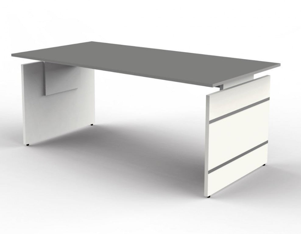 Das neue Büromöbelprogramm mit Applikationen in Alusilber und trendigen Dekoren. Sie können zwischen 3 Tischplattendekoren ( Weiß, Grafit oder Wenge) und 4 Gestellformen (C-Fuß-Gestell Typ B, C und D oder 1 Wangengestell Typ A) wählen. Optional können die Schreibtische mit einer Knieraumblende und einer Sichttrennwand werden. Zudem bietet das C-Fuß-Gestell Typ B und C und das Wangengestell Typ A die Möglichkeit die Tischplatte in der Höhe einzustellen.Stauraum für die Verkabelung bietet der serienmäßig vorhandene Kabelkanal. Zur Vergrößerung der Arbeitsfläche oder für kleinere Besprechungen ergänzen Sie die Schreibtische durch entsprechende Anbautische. Als Ergänzug stehen weiße Rollcontainer mit großem Stauraum, da 80 cm tief, zur Verfügung. Wählen Sie hier zwischen 3 Schubladen oder 1 Schublade und Hängeregistratur. Vielfältige Kombinationsmöglichkeiten bietet der Regalbereich. Der Korpus, generell in weiß mit feinem alusilber-Akzent an der Vorderkante, kann durch Türen in 2 OH oder 5 OH , aber auch durch Schubladen für Hängeregistratur vervollständigt werden.