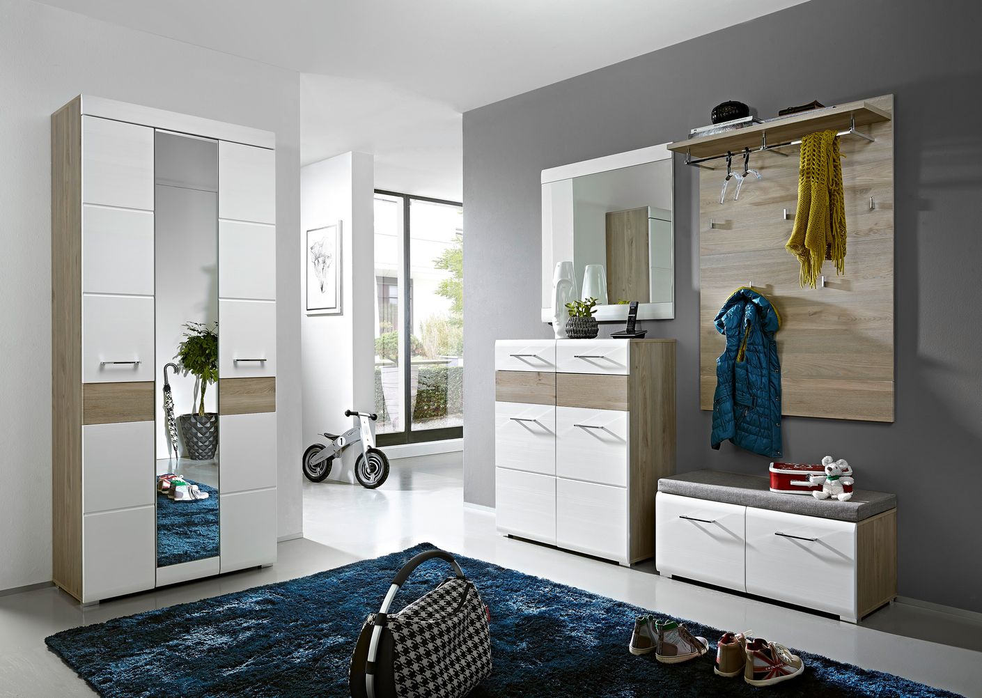 Die stilvolle Garderobe FUNNY bietet Ihnen im Flur diverse Stauraum-Möglichkeiten â so erhalten Jacken, Schuhe & Co. einen ansehnlichen Platz. Die Fronten aus weißer MDF Struktur sind in Kombination mit dem Korpus in Silbereiche eine gelungene Mischung von modernen und klassischen Design-Elementen.