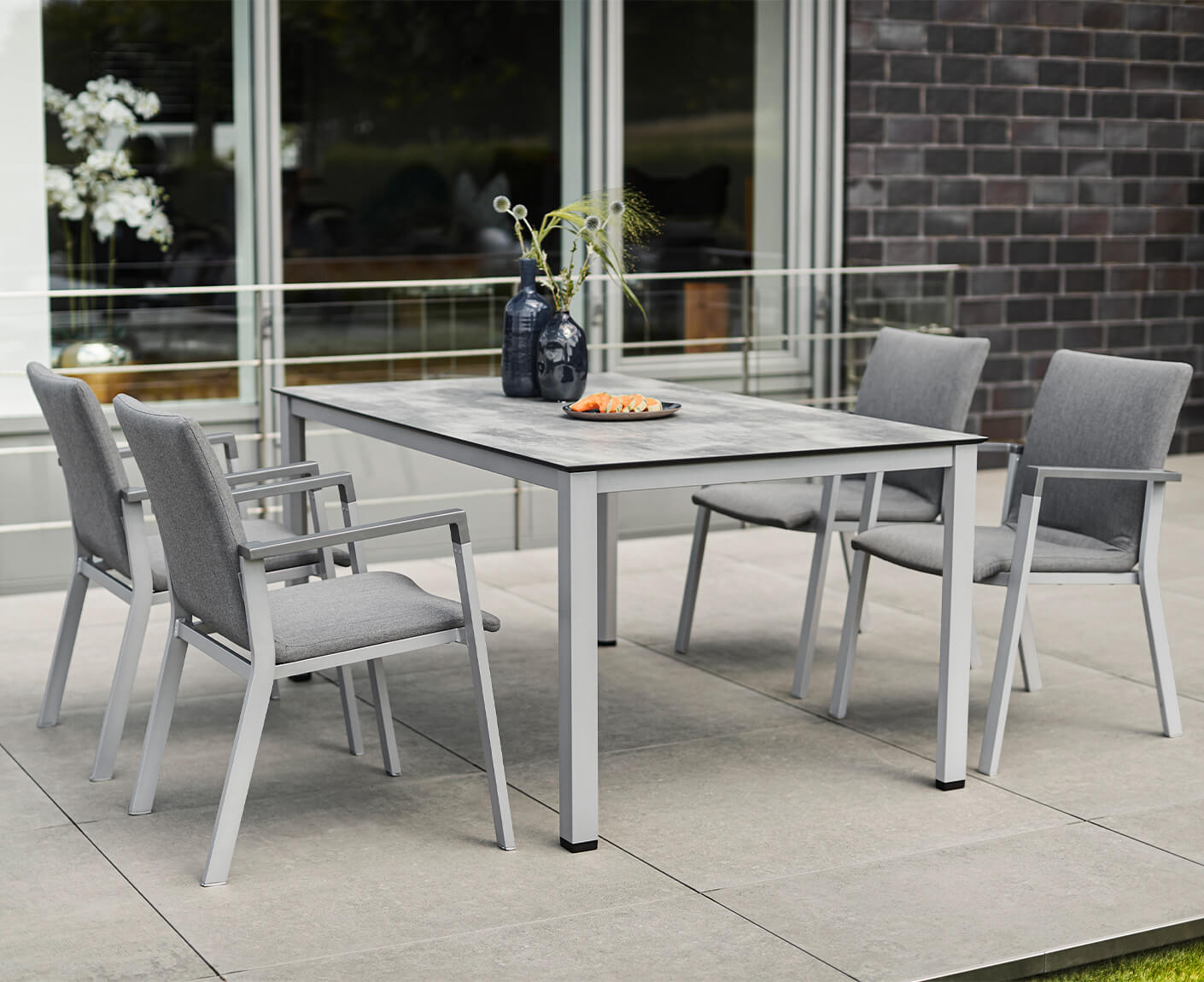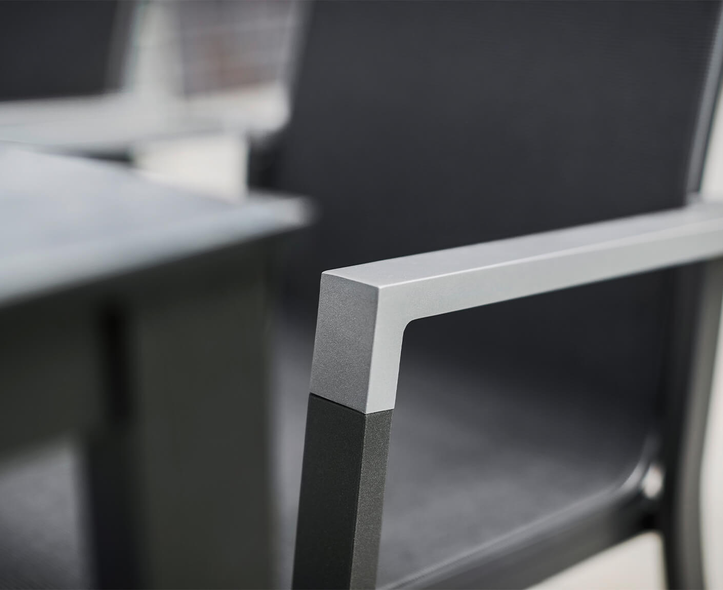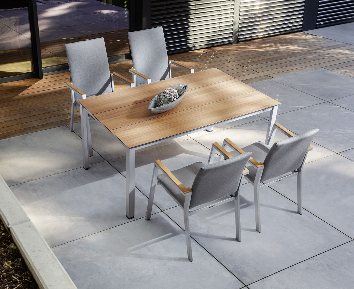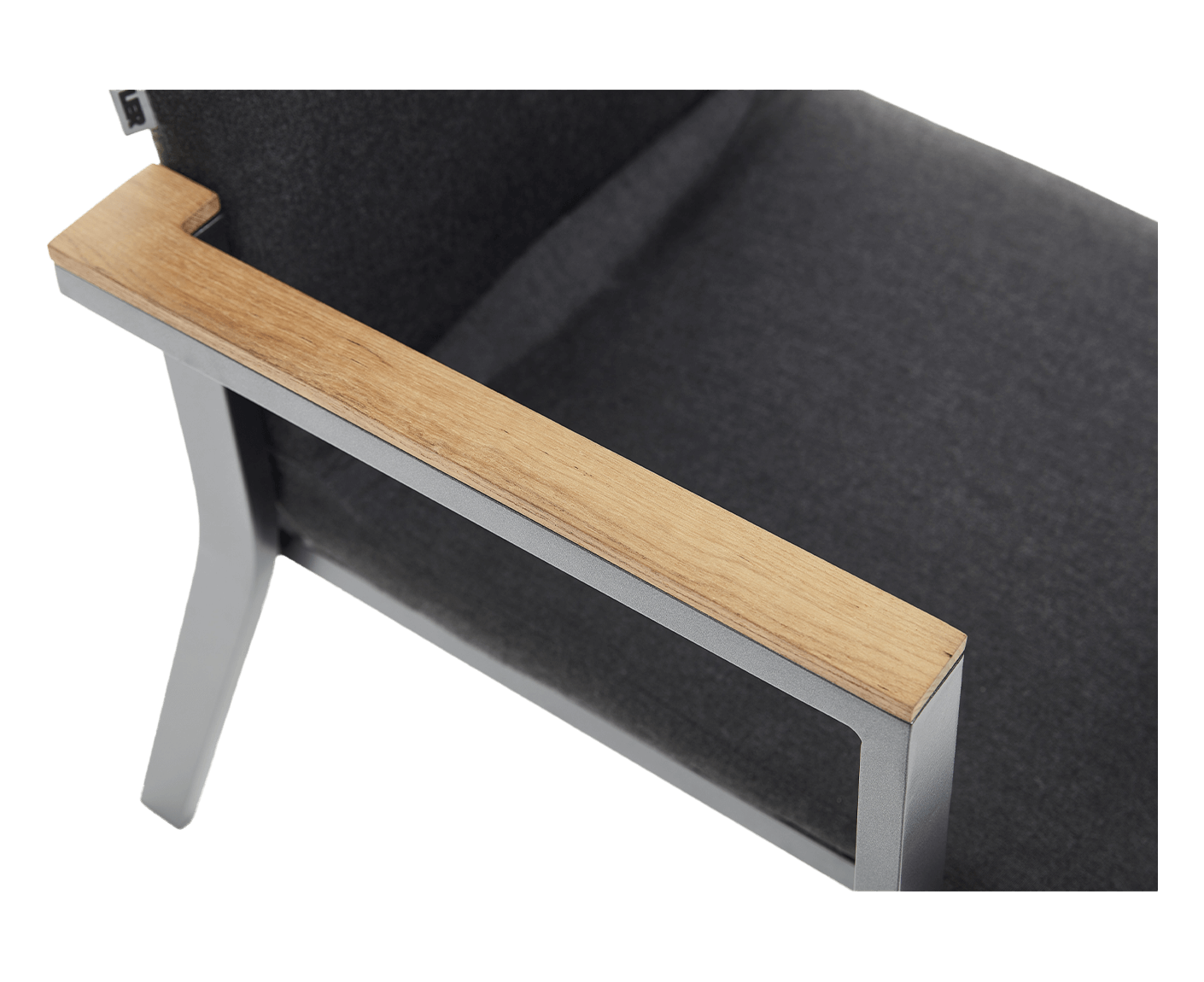 - Solides, formschönes Aluminium-Gestell mit Armlehnen aus Aluminium oder aus Teakholz