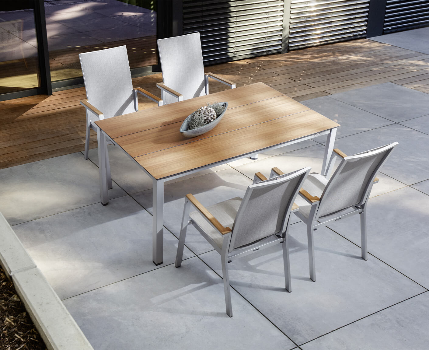 - Solides, formschönes Aluminium-Gestell mit Armlehnen aus Aluminium oder aus Teakholz