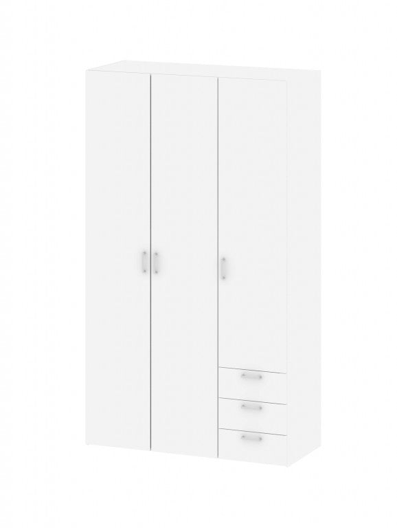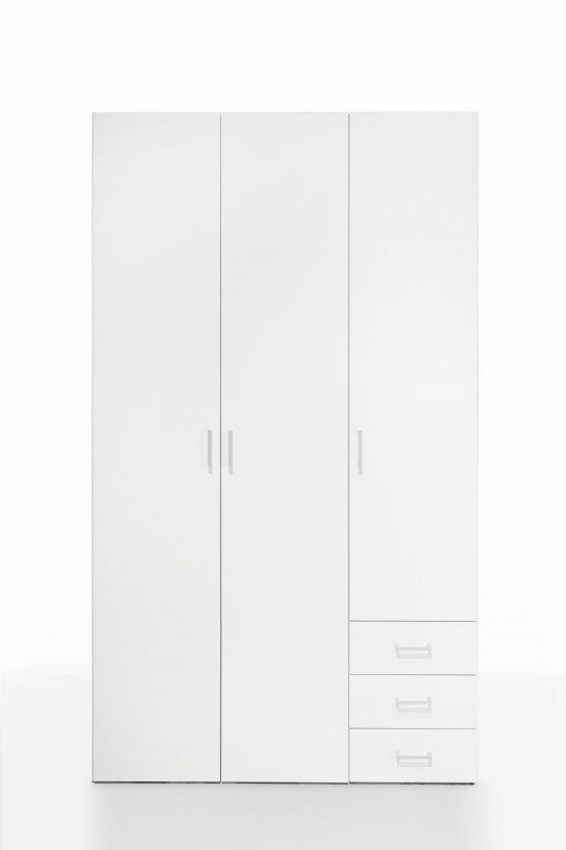 - Kleiderschrank mit 3 Türen und 3 Schubladen auf Kunststoffschienen. Hinter der rechten Tür befinden sich 4 Ablagefächer. Links 1 breiter Fachboden und 1 Kleiderstange. Griffe aus Kunststoff.