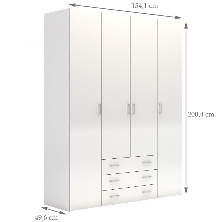 - Kleiderschrank mit 4 Türen und 3 Schubladen auf Kunststoffschienen. Hinter den beiden mittleren Türen befinden sich 1 breiter Fachboden, sowie 1 Kleiderstange. Rechts und links jeweils 4 Fachböden. Griffe aus Kunststoff.