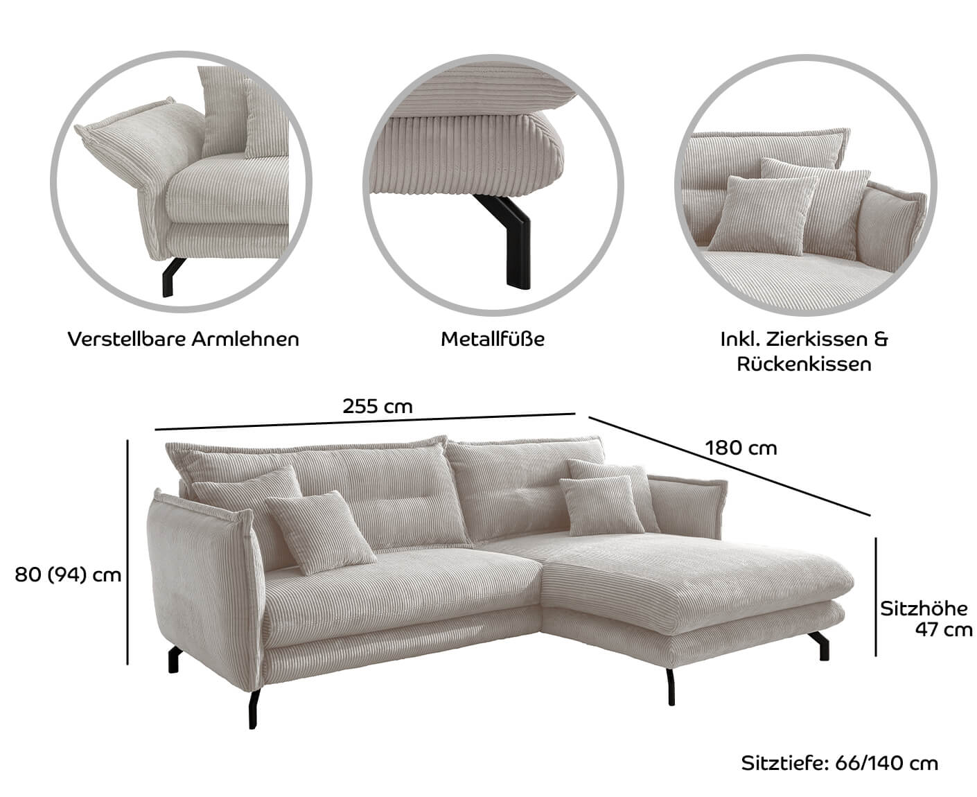 La Spezia Ecksofa 255 x 180 cm, Cord