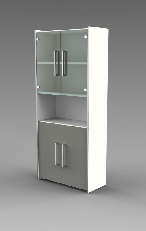 - 1 breites Regal 5 OH mit Glas- und Holztürenpaar und 4 Fachböden.