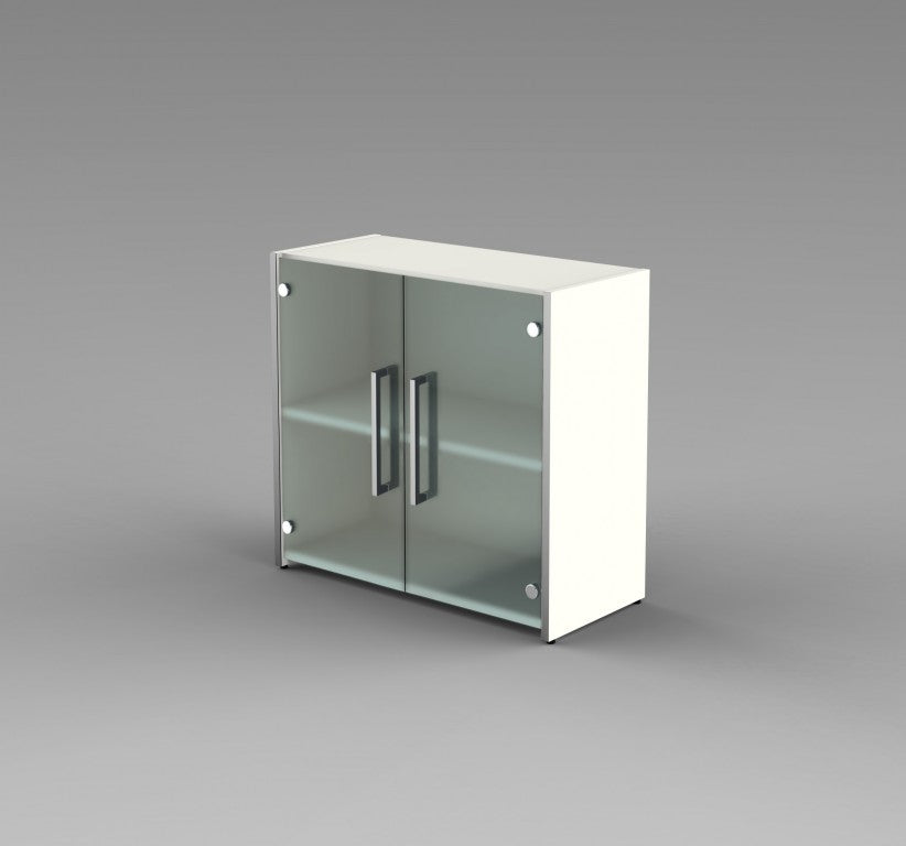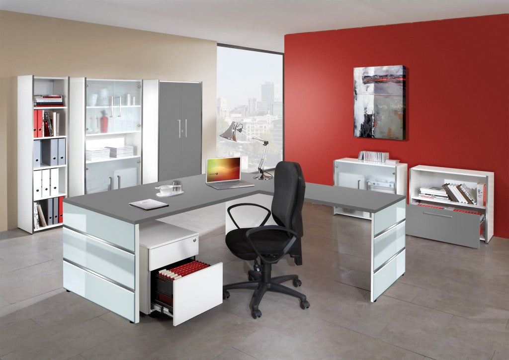 Das moderne Büromöbelprogramm Lugano mit Applikationen aus Glas und dekorativen Streifen aus Edelstahl. Es stehen 2 Schreibtischgestelle zur Auswahl. Ein C-Fuß Gestell mit zwei 28 mm starken senkrechten Rohren in alusilber, die eine 220 mm breite Seitenblende aus einer Gütespanplatte mit Glasauflage umrahmen. Das Gestell ist aufgesetzt auf einem 50x25 mm starken Flachovalrohr als Fußausleger. Die zweite Gestellvariante ist ein Wangengestell aus 25 mm starker E1- Gütespanplatte mit 3 aufgesetzten 4 mm starken Glasoberflächen, die jeweils durch einen Edelstahlstreifen voneinander getrennt sind. Beide Tischmodelle verfügen über einen horizontalen Kabelkanal, sowie Stellfüße. Sie wählen zwischen 4 verschiedenen Tischplatten-Dekoren. Durch den Einsatz von Anbautischen, erhalten Sie eine Winkelkombination zur Vergrößerung der Arbeitsfläche oder für kleine Besprechungen. Als Ergänzug stehen weiße Rollcontainer mit großem Stauraum, da 80 cm tief, zur Verfügung. Wählen Sie hier zwischen 3 Schubladen oder 1 Schublade und Hängeregistratur. Die Regale auf Stellfüßen und mit einer frontalen Zierleiste in alusilber können sowohl einzeln als auch aneinandergebaut aufgestellt werden. Zur besseren Raumnutzung gibt es Eckregale. Die Fachhöhen sind auf Ordnerhöhen abgestimmt. Es stehen abschließbare Holz-Vorbautürensätze in 2 und 5 OH , sowie Glas-Vorbautüren in 2 OH zur Verfügung.