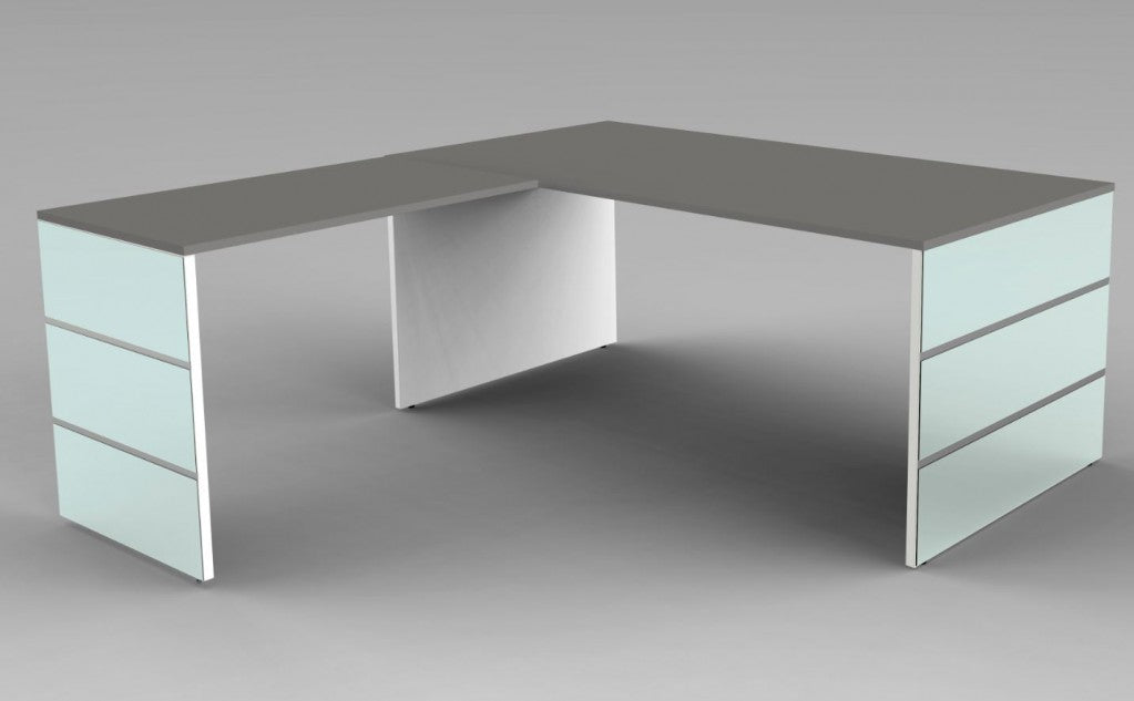 -WINKELKOMBINATION mit Schreibtisch und Anbautisch. Wangengestell, 3-fach Glasverblendet, mit 2 Edelstahlstreifen