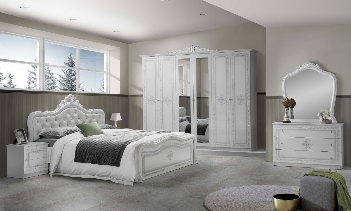 Möbel der Serie: Kleiderschrank, Bett, Nachtkästchen, Kommode, Spiegel
