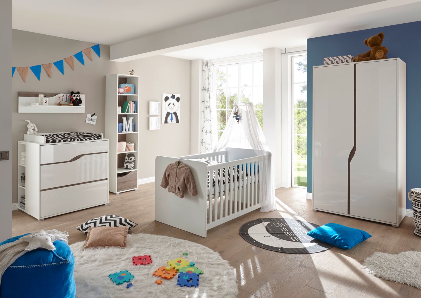 Möbel der Serie: Kleiderschränke, Babybett, Kommode, Wickelkommode, Wandboard, Regal