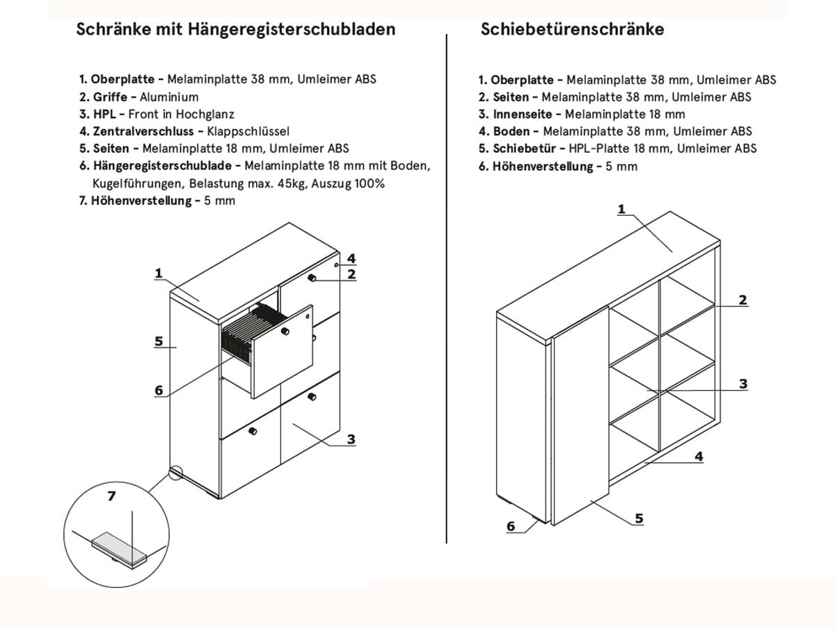 - Seiten: Melaminplatte 38 mm, ABS-Kanten