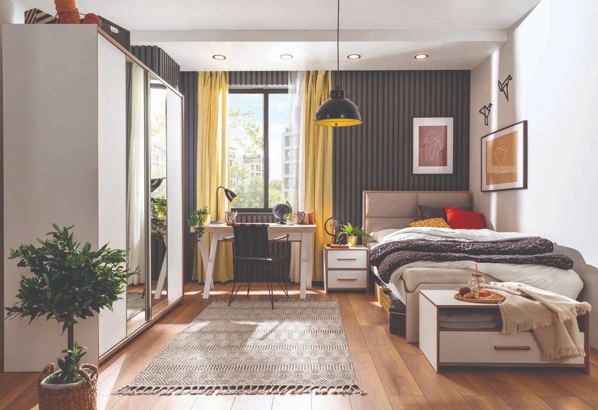 Möbel der Serie: 6x Kinderbett, 2x Etagenbett, 3x Kleiderschränke, 2x Schwebetürenschränke, 4x Kommode, Schreibtisch, Bücherregal, Nachtkommode, Arbeitstisch, 2x Wandregal