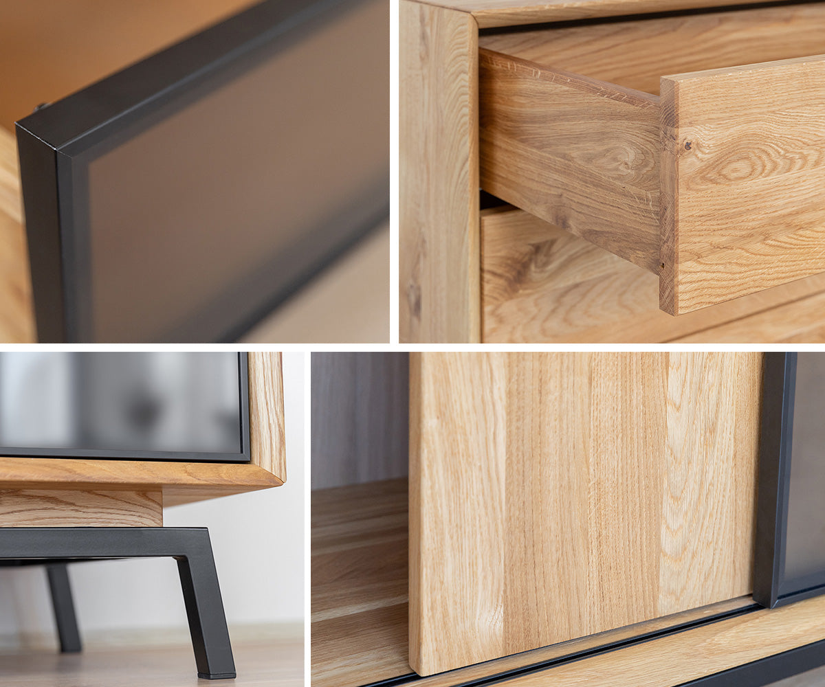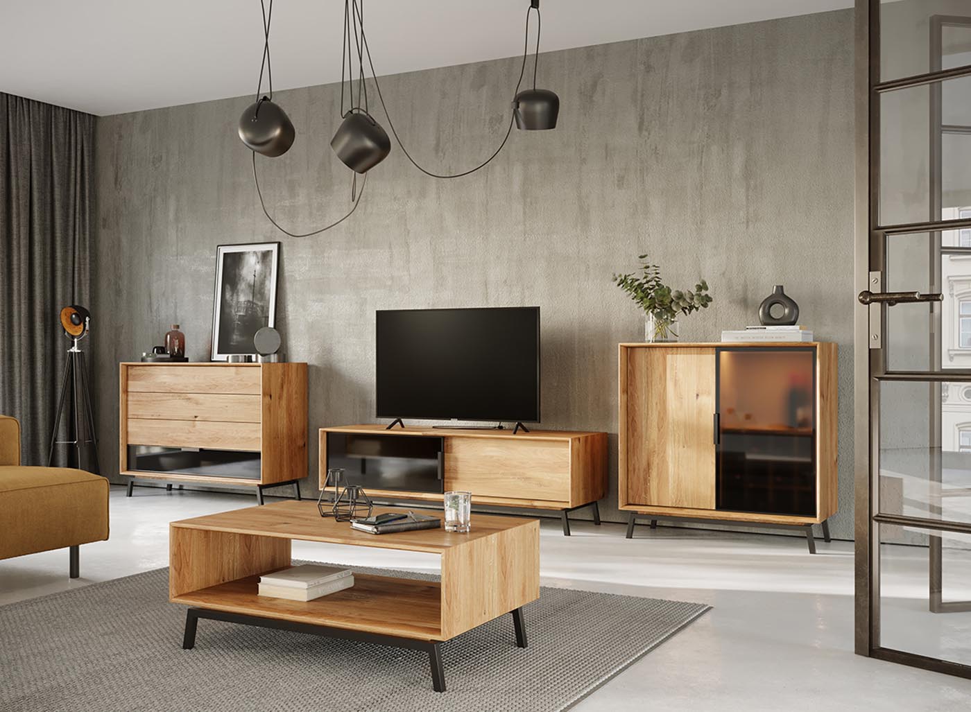 Gesamte Produkte der Serie: Kommode, Standvitrine, verschiedene TV-Unterschrank, Weinregal, Couchtisch