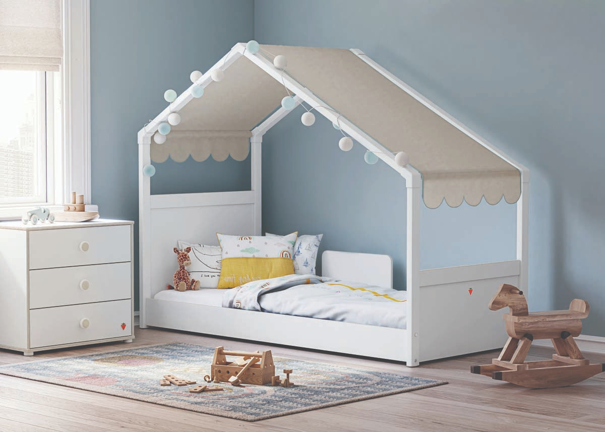 Bett: Babybett mit verschiedenen Stäben zum Verberssern des Tastsinns / Kinderbett mit Dach und Kopfteil