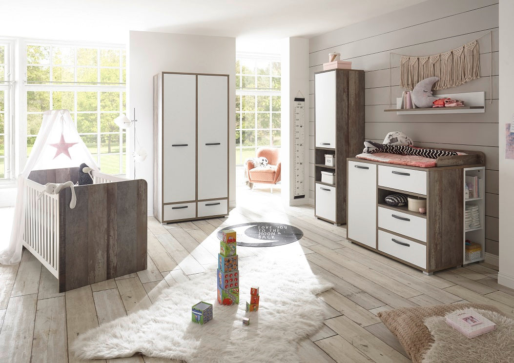 Möbel der Serie: Kleiderschränke, Babybett, Kommode, Wickelkommode, Wandboard, Regal