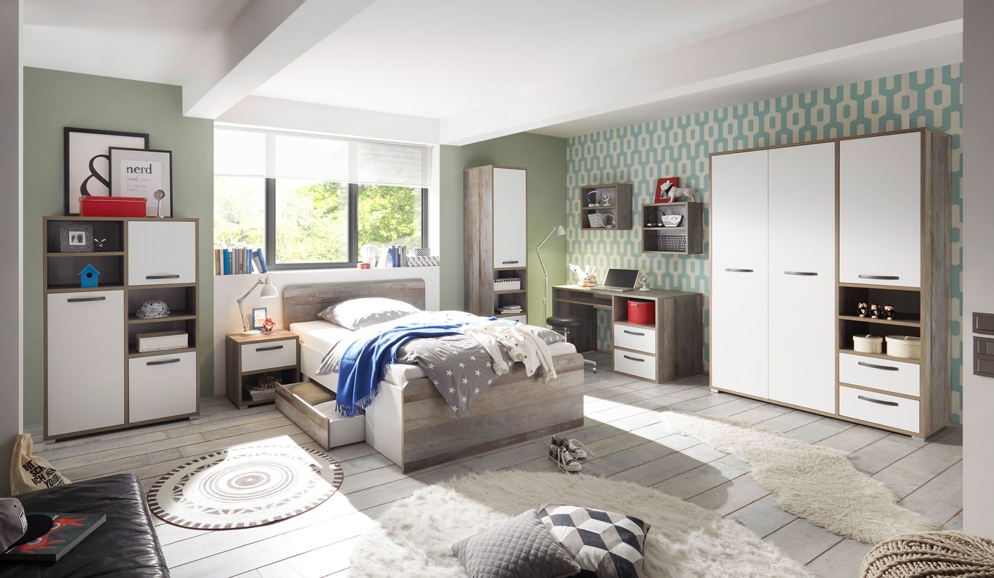 Möbel der Serie: Kleiderschränke, Standregal, Bett, Nachtkommode, Schreibtisch, Highboard, Hängeregal, TV Möbel