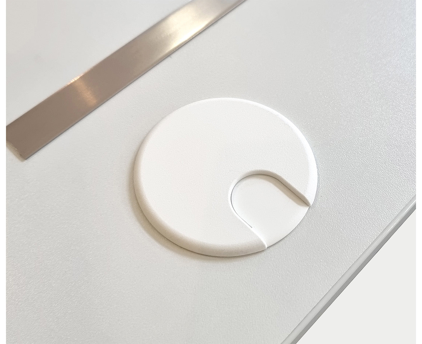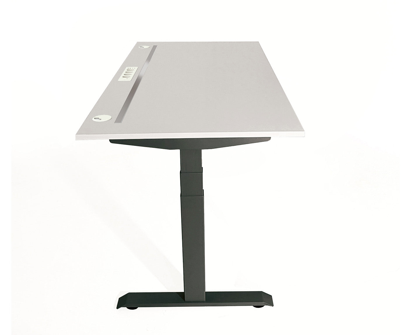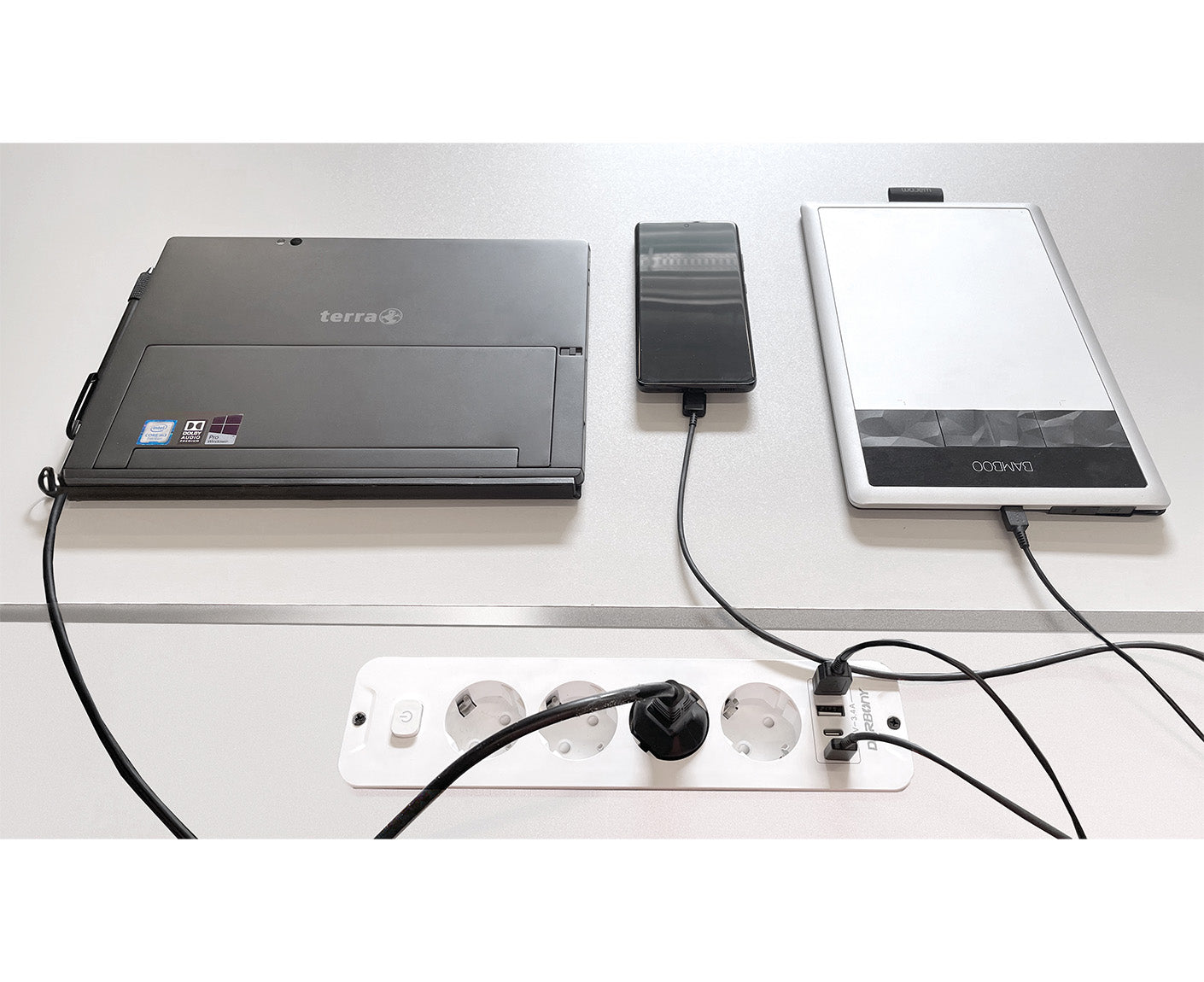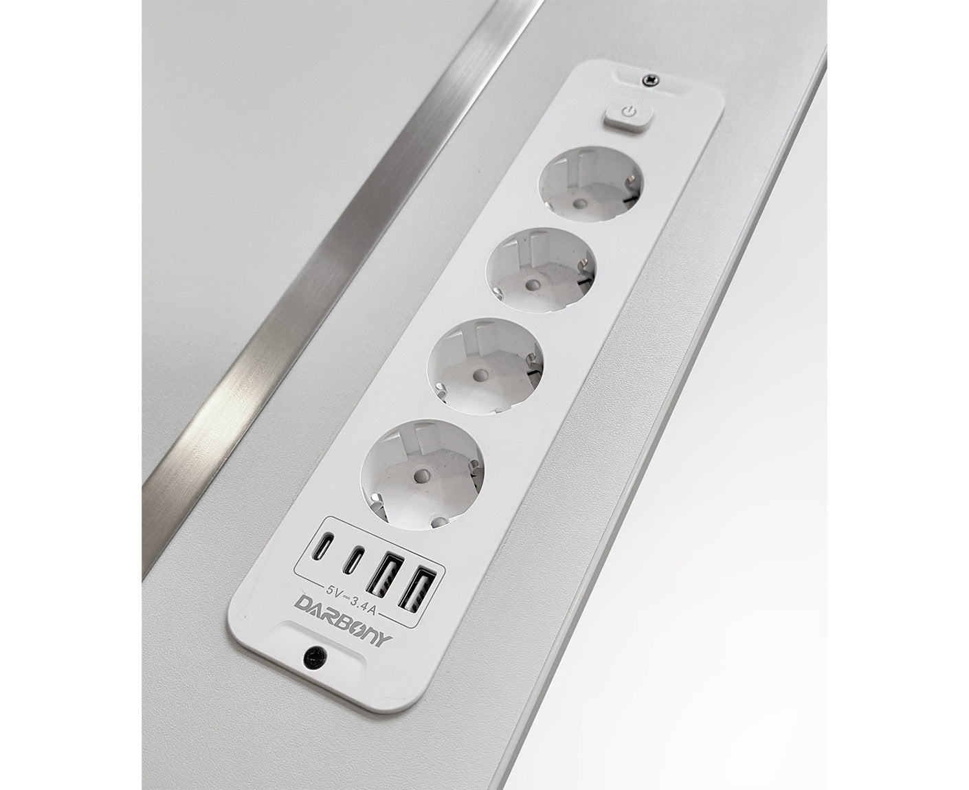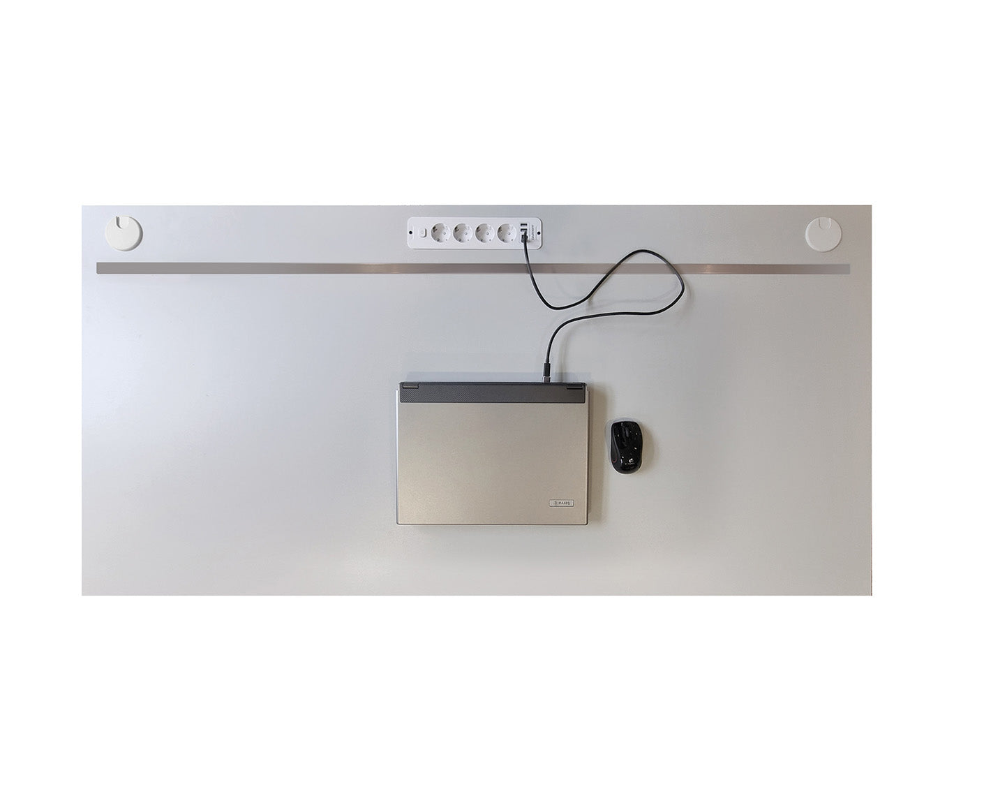 - Tischplatte mit integrierter Steckdosenleiste (4-fach, 2 x USB-A, 2 x USB-C) und 2 Kabeldurchlässen