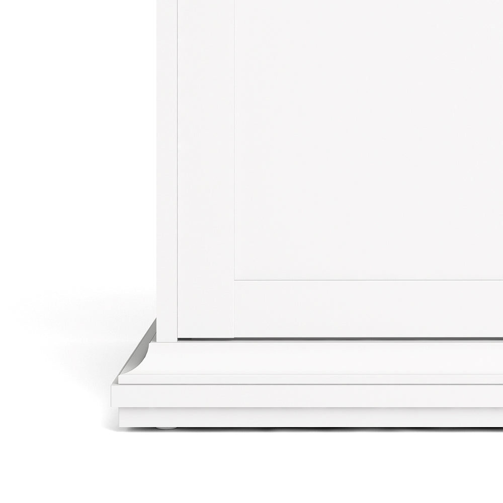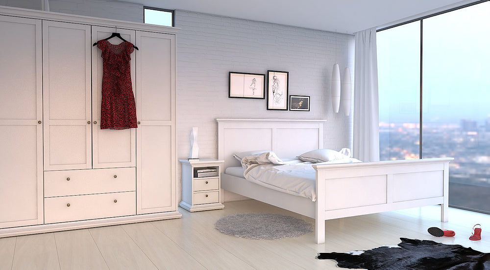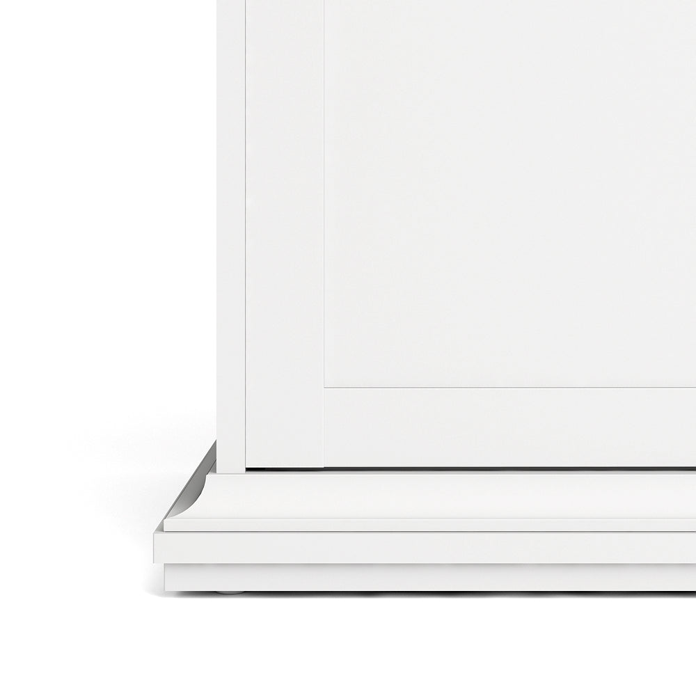 Paris von Tvilum ist perfekt für Personen, die ein romantisch angehauchtes Mobiliar lieben. Das Sortiment enthält Möbelstücke für den gesamten Wohnsitz, wie Betten, Kommoden, Schränke, TV-Möbel, Vitrinen, Sideboards, Tische und Stühle. Die Paris-Kollektion ist aus Platten mit einem 1,8-cm-Profil gefertigt, oben und unten sind schöne Zierleisten mit Hohlkehle passend, die den harmonischen Eindruck hervorheben. Die Kontur einiger der Wohnmöbel ist breiter als 1,8 cm.Die romantische Atmosphäre der Paris-Kollektion wird durch die Sprossenfenster in den Vitrinen, die Griffe im antiken Design und die Hohlkehlleisten noch verstärkt. Zusätzlich können als Ergänzung erworben werden.