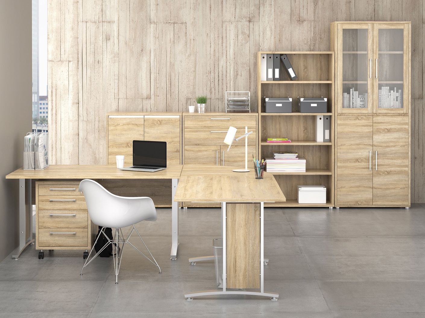Prima bietet Schreibtische, Rollcontainer und Regale, die man wahlweise mit Schranktüren und/oder Schubladen ausstatten kann.