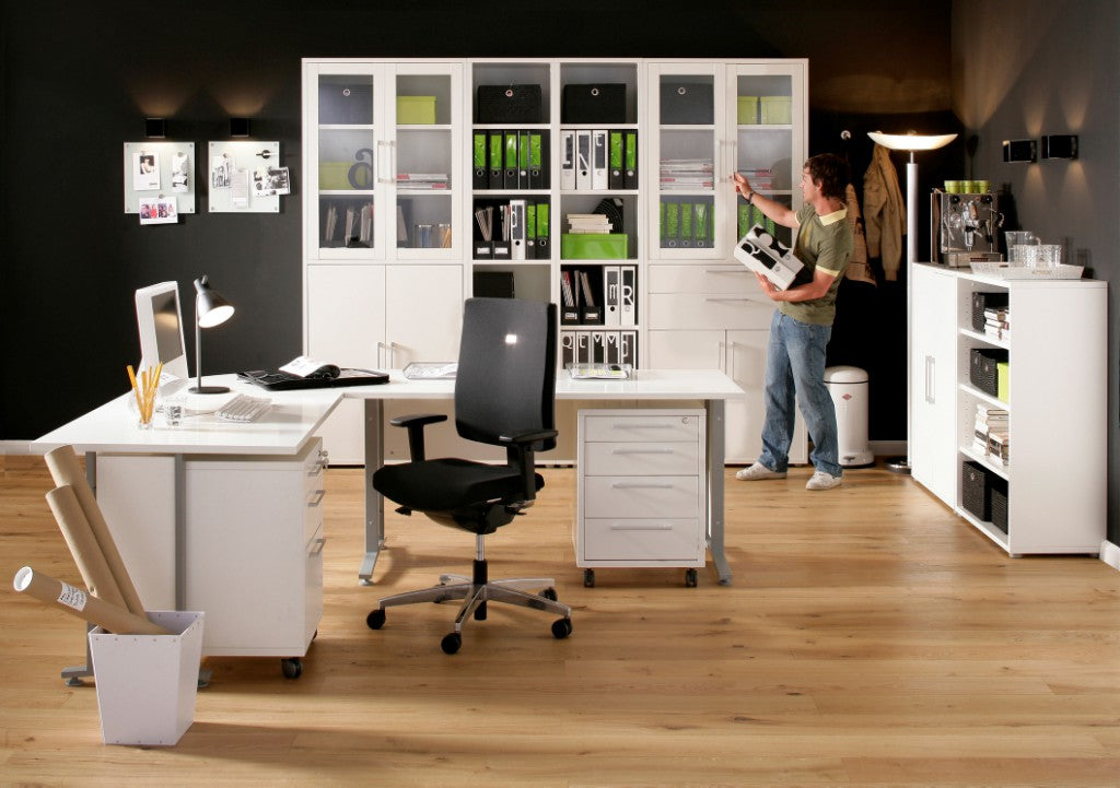 Prima bietet Schreibtische, Rollcontainer und Regale, die man wahlweise mit Schranktüren und/oder Schubladen ausstatten kann.