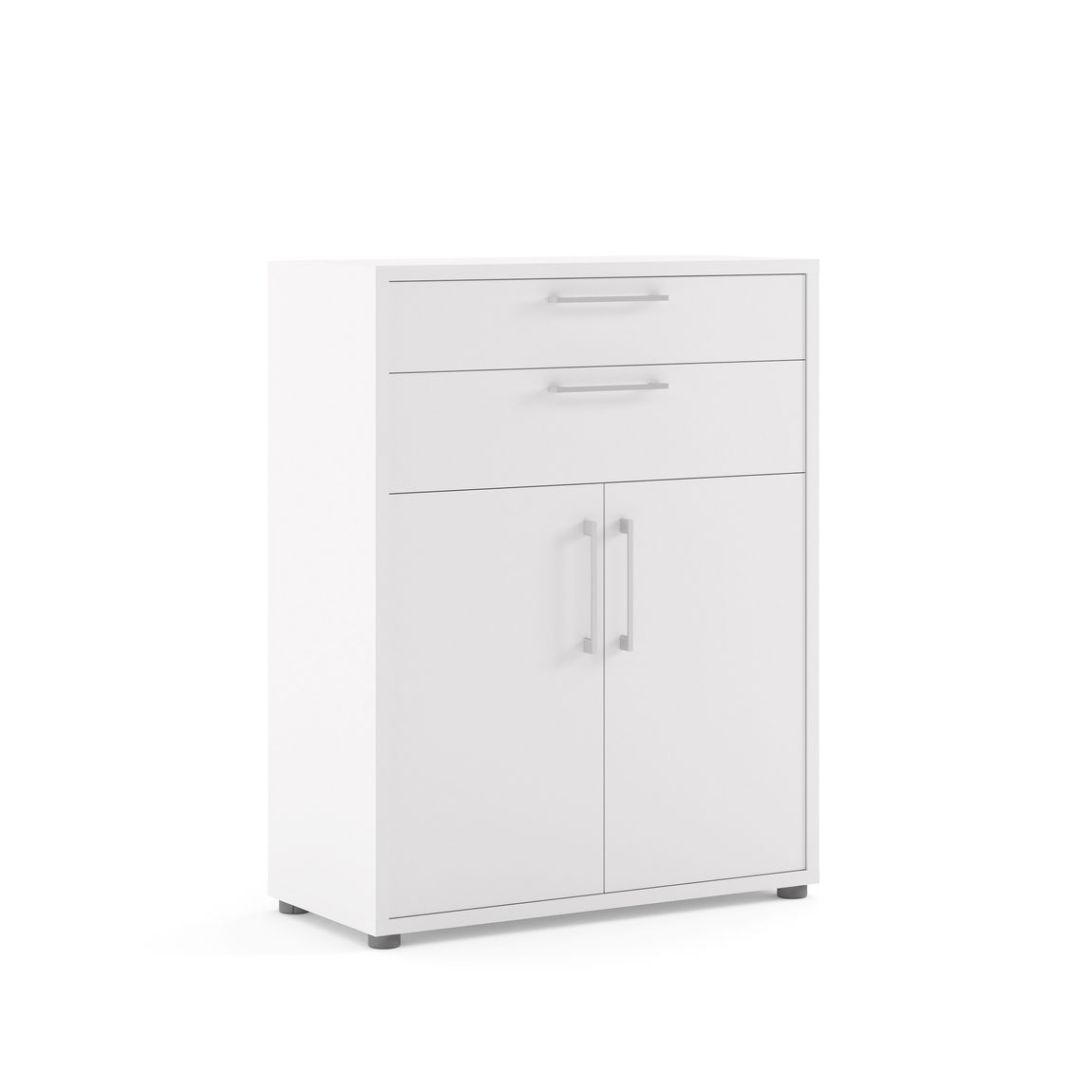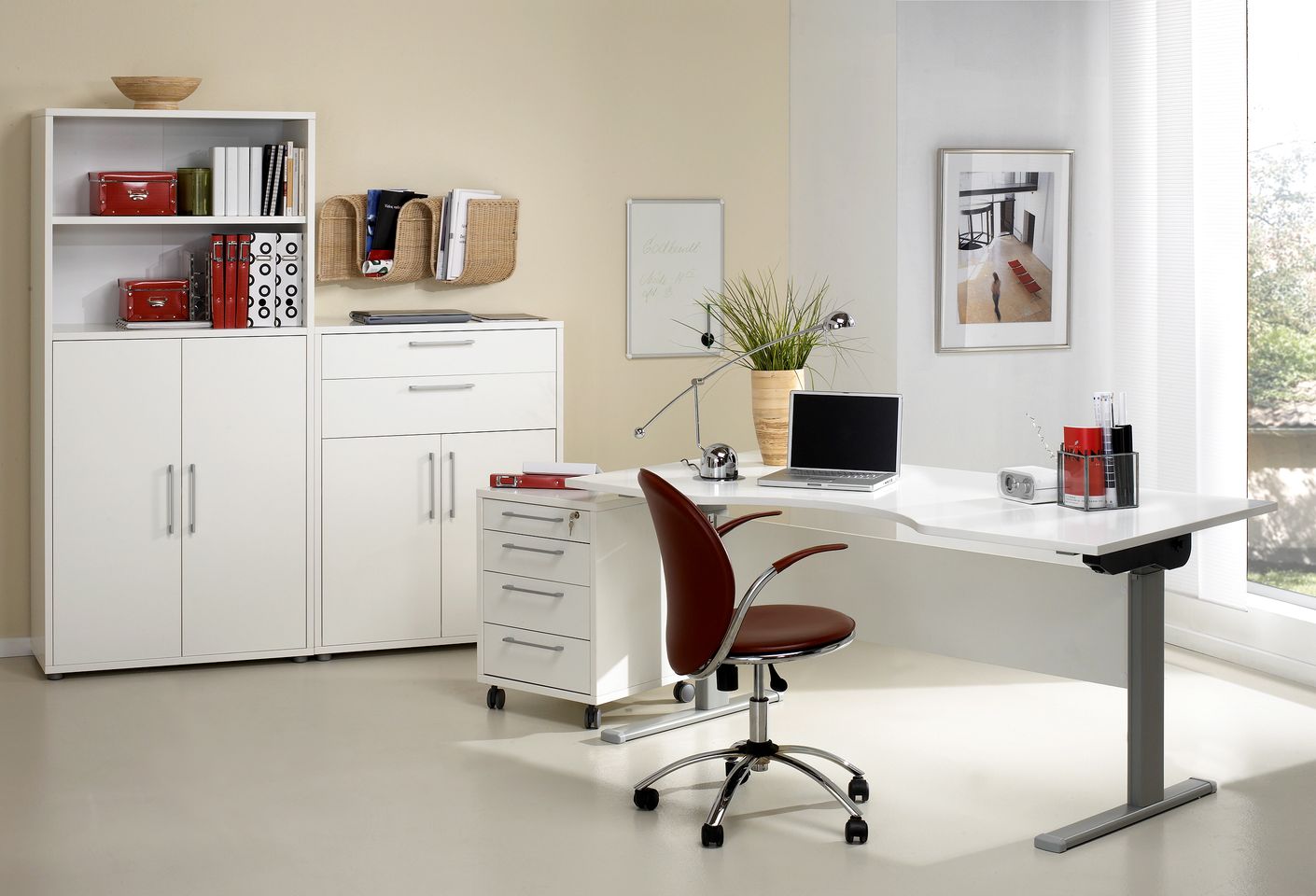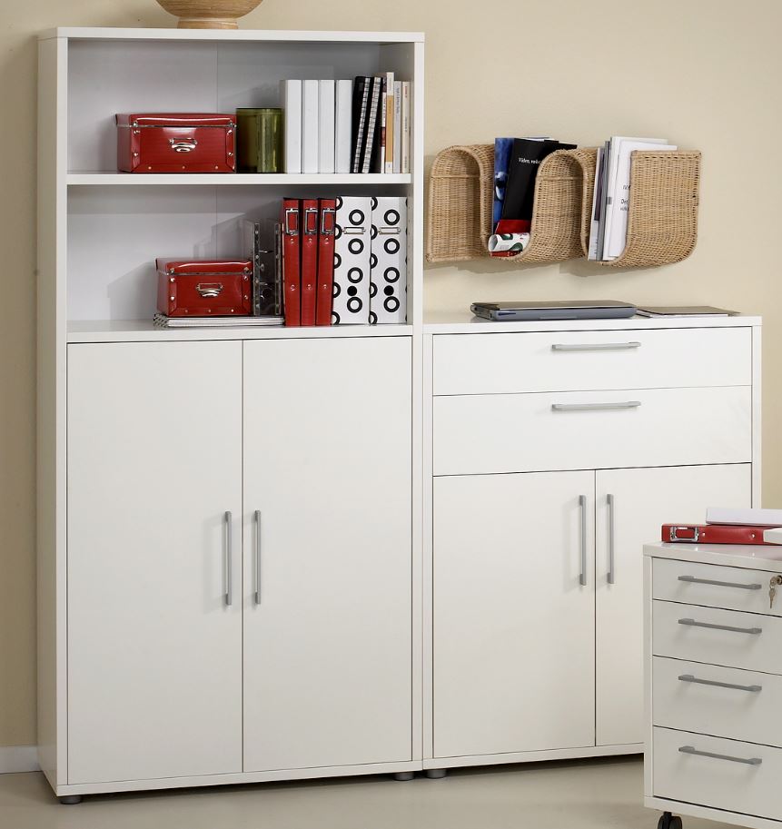 Prima bietet Schreibtische, Rollcontainer und Regale, die man wahlweise mit Schranktüren und/oder Schubladen ausstatten kann.