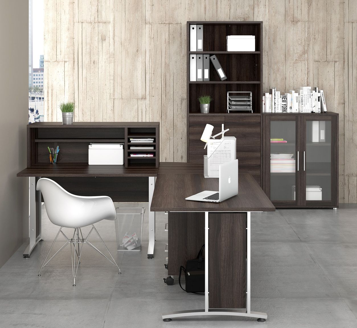 Prima bietet Schreibtische, Rollcontainer und Regale, die man wahlweise mit Schranktüren und/oder Schubladen ausstatten kann.