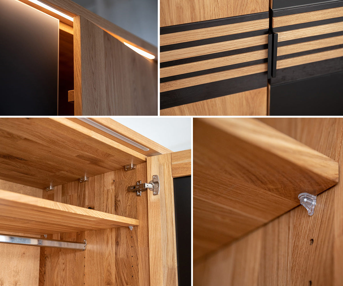 Front: Massivholz Eiche Natur, Applikation Schwarz Massivholz Eiche