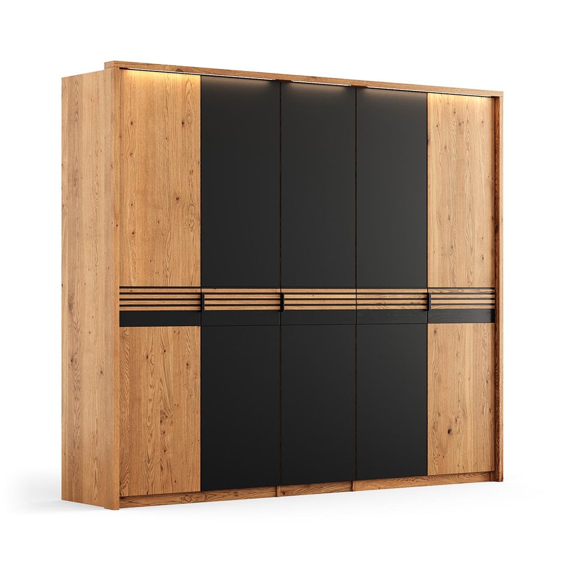 Ravello Kleiderschrank Drehtürenschrank 5-türig 256 cm Massivholz Eiche, geölt/Glas Schwarz