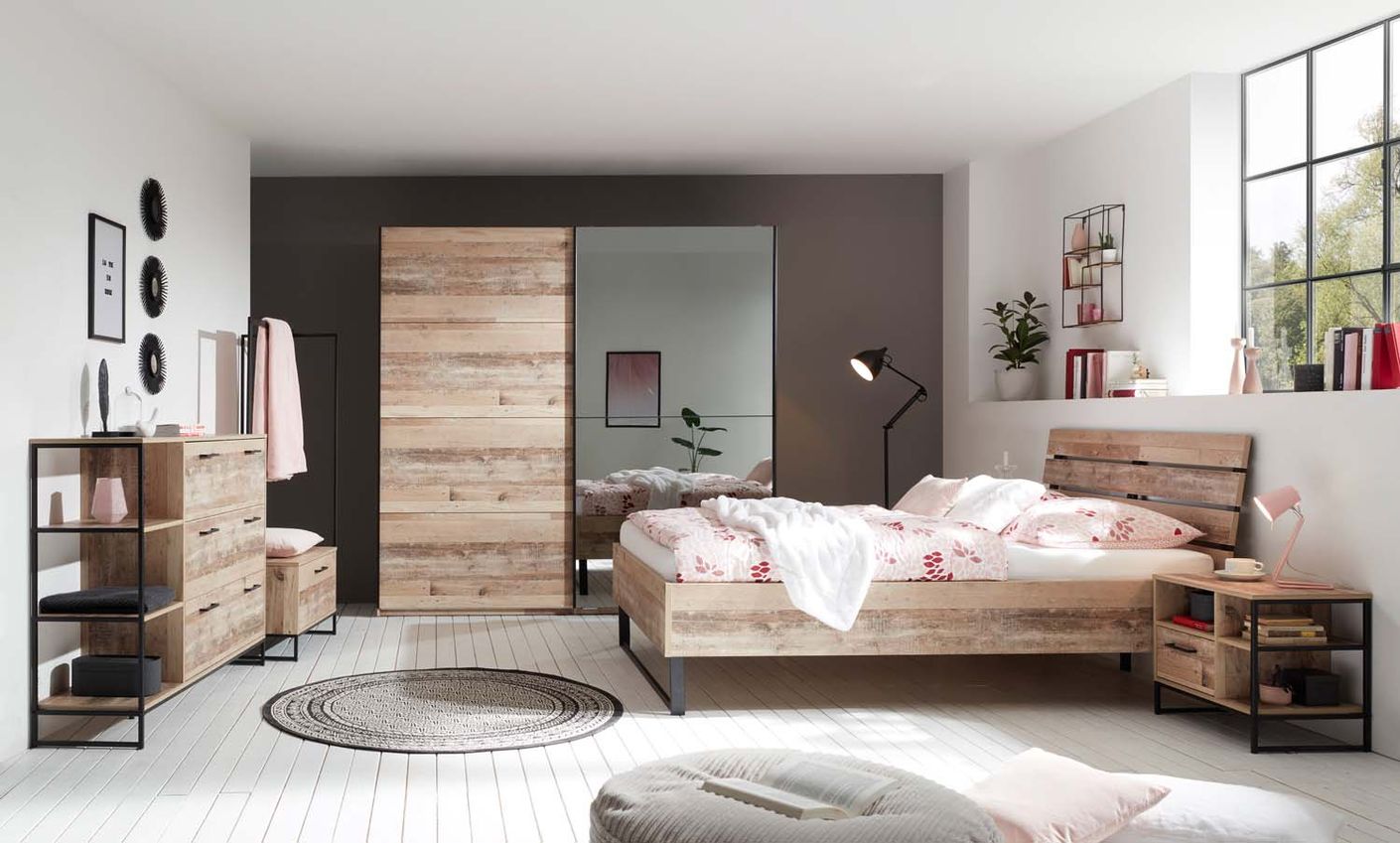 Möbel der Serie: Kleiderschrank, Bett, Nachtkästchen und Kommode