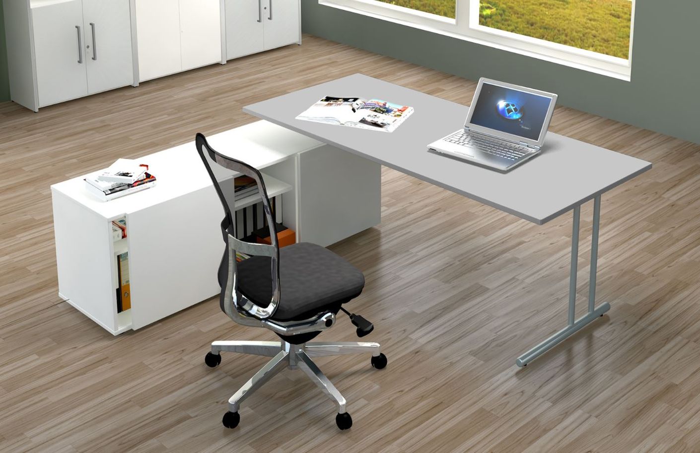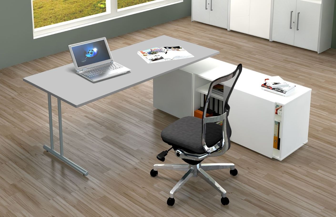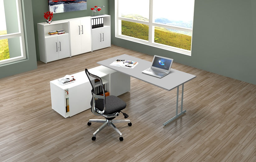 Funktionelles Büromöbelprogramm, dass sich durch eine moderne Optik auszeichnet. Die Schreibtische mit massivem C-Fuss-Gestell in Alusilber bestehen aus einem Stahlrahmen mit Ø28 mm (Standrohr) bzw. 38 mm Ø (Fußausleger) und verfügen über eine angenehme Arbeitshöhe von 75 cm. Dank dieses massiven Tischplatten-Unterbaus aus Stahl, beträgt die erforderliche Tischplattenstärke nur 19 mm. Dies verleiht dem Tisch ein ästethisches Aussehen und vermittelt eine gewisse Leichfüßigkeit. Wählen Sie zwischen Tischplatten aus Holz in 4 verschiedenen Farben (Weiß, Lichtgrau, Grafit oder Anthrazit) aus E1 Gütespanplatten, melaminharzbeschichtet, mit 2 mm ABS-Kante, in 3 verschiedenen Tischbreiten (1600, 1800 und 2000 mm), jeweils mit einem Kabelkanal unter der Tischplatte zur Aufnahme von Steckdosenleisten.