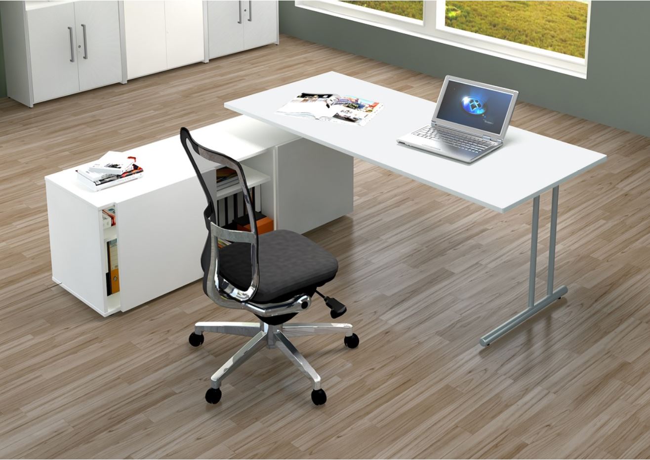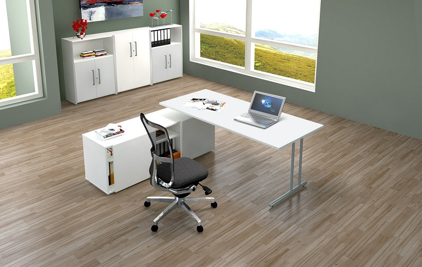 Funktionelles Büromöbelprogramm, dass sich durch eine moderne Optik auszeichnet. Die Schreibtische mit massivem C-Fuss-Gestell in Alusilber bestehen aus einem Stahlrahmen mit Ø28 mm (Standrohr) bzw. 38 mm Ø (Fußausleger) und verfügen über eine angenehme Arbeitshöhe von 75 cm. Dank dieses massiven Tischplatten-Unterbaus aus Stahl, beträgt die erforderliche Tischplattenstärke nur 19 mm. Dies verleiht dem Tisch ein ästethisches Aussehen und vermittelt eine gewisse Leichfüßigkeit. Wählen Sie zwischen Tischplatten aus Holz in 4 verschiedenen Farben (Weiß, Lichtgrau, Grafit oder Anthrazit) aus E1 Gütespanplatten, melaminharzbeschichtet, mit 2 mm ABS-Kante, in 3 verschiedenen Tischbreiten (1600, 1800 und 2000 mm), jeweils mit einem Kabelkanal unter der Tischplatte zur Aufnahme von Steckdosenleisten.