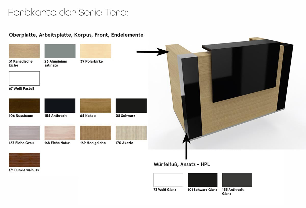 Farbpalette der Serie Tera - Oberplatte / Front / Korpus / Stützfuß / Würfelfuß / Endelemente