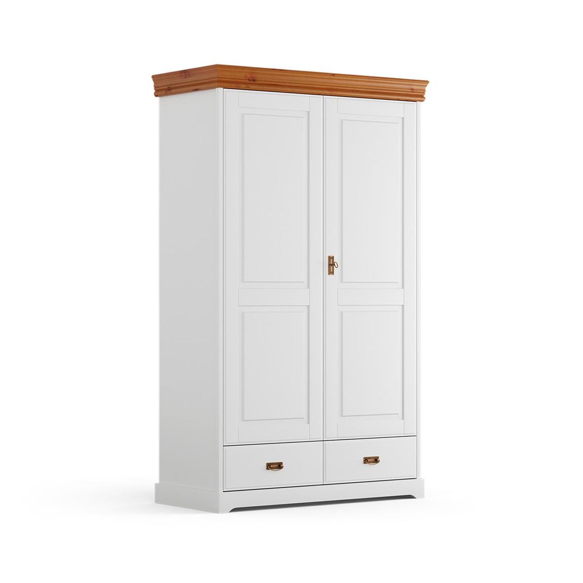 Toskania Massivholz Kleiderschrank 2-türig mit Schubladen 132x218 cm Weiß/Kiefer, gebeizt