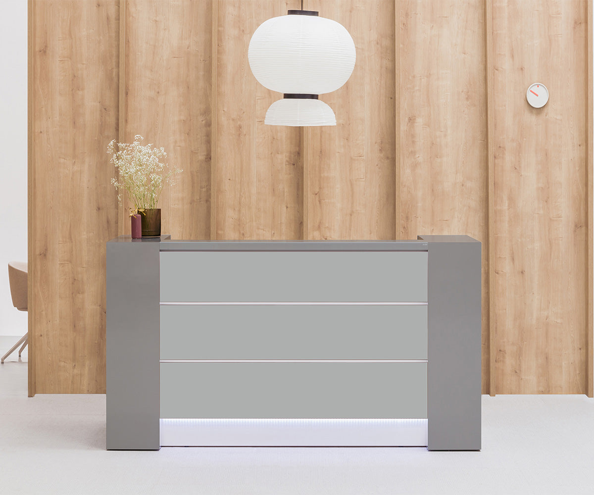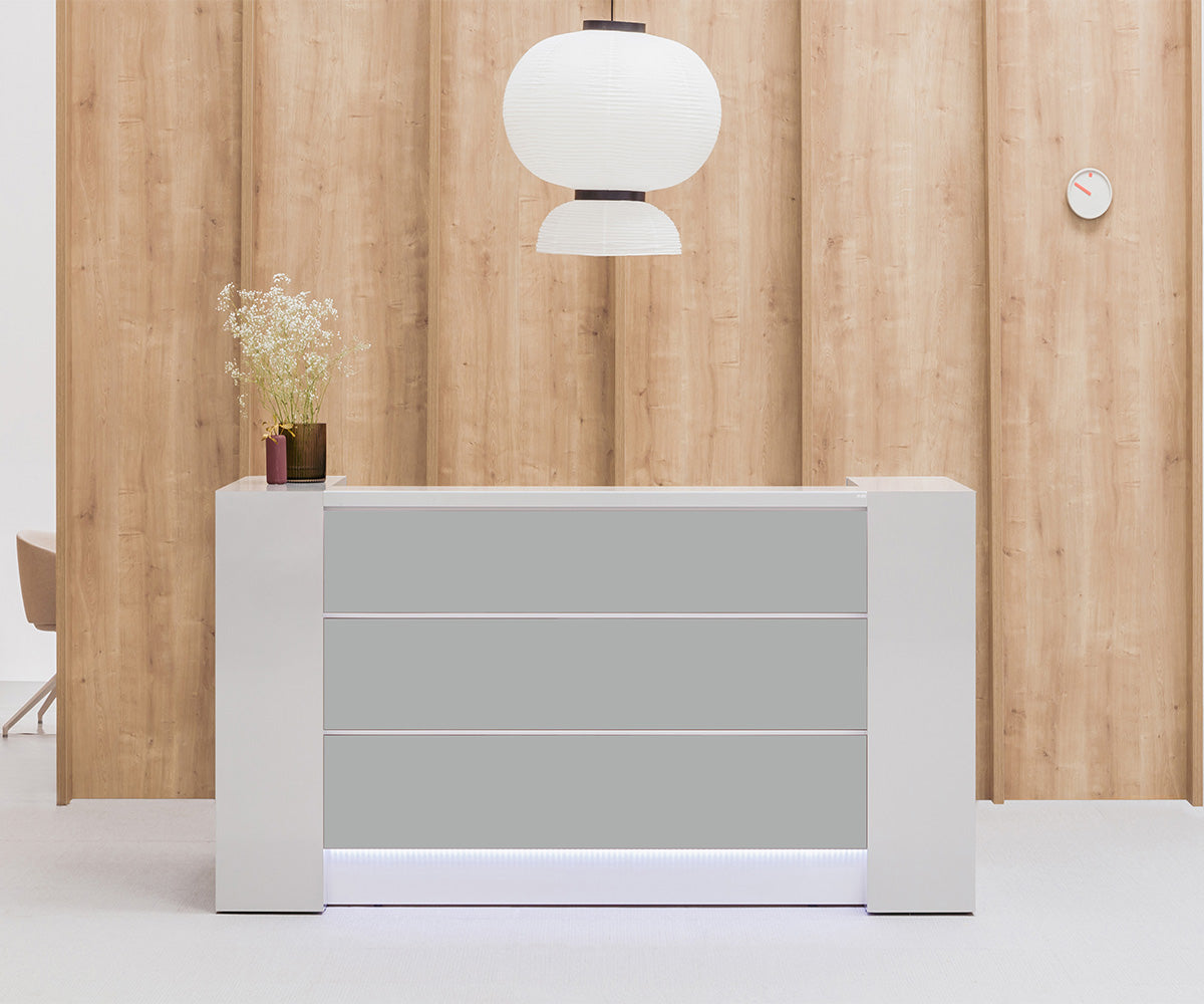 Valde 3 Empfangstheke, mit Endregal gerade, Grau Matt / Größe und Korpus wählbar