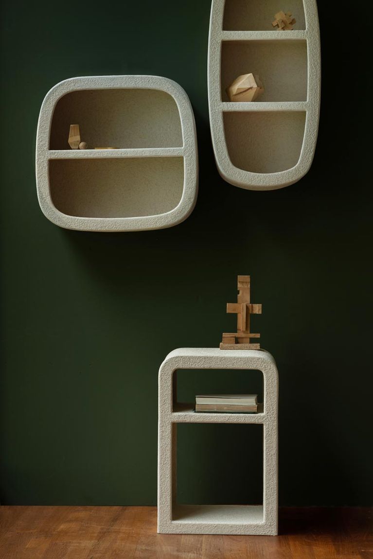- recyceltes Marmor auf MDF, Holzspanwerkstoff.
