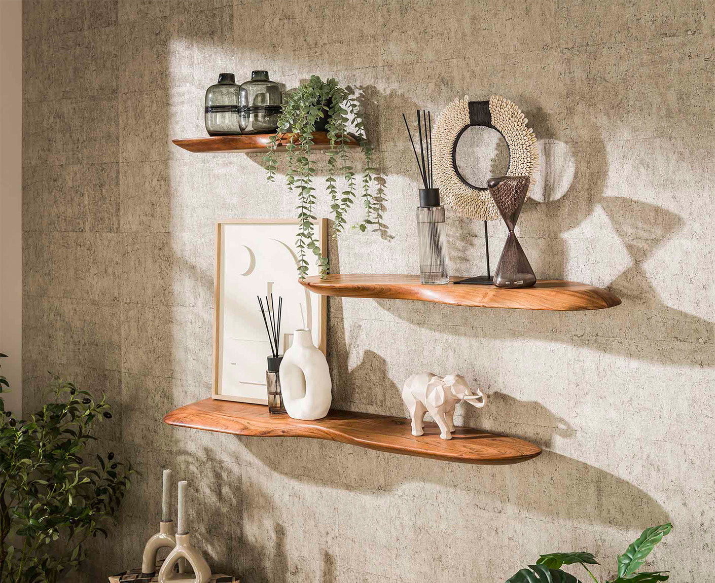 Wandregal, verschiedene Größen, Akazie Massivholz Natur